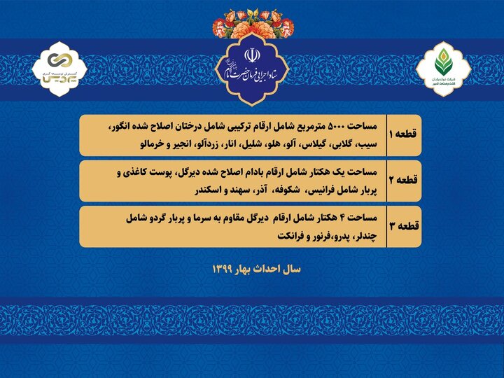 در مراسمی با حضور معاون اجتماعی و امور استان های ستاد اجرایی فرمان حضرت امام (ره)، مدیرعامل هلدینگ کشاورزی و صنایع غذایی ستاد اجرایی فرمان حضرت امام (ره)، مدیرکل ستاد اجرایی در استان البرز، مدیرعامل شرکت گسترش توسعه گری پردیس و جمعی از مدیران و مسئولین هلدینگ کشاورزی ستاد اجرایی، باغ خشکباری نیمه متراکم و هوشمند با نهال اصلاح شده دیرگل و پرتولید در کمالشهرکرج (استان البرز) افتتاح شد.