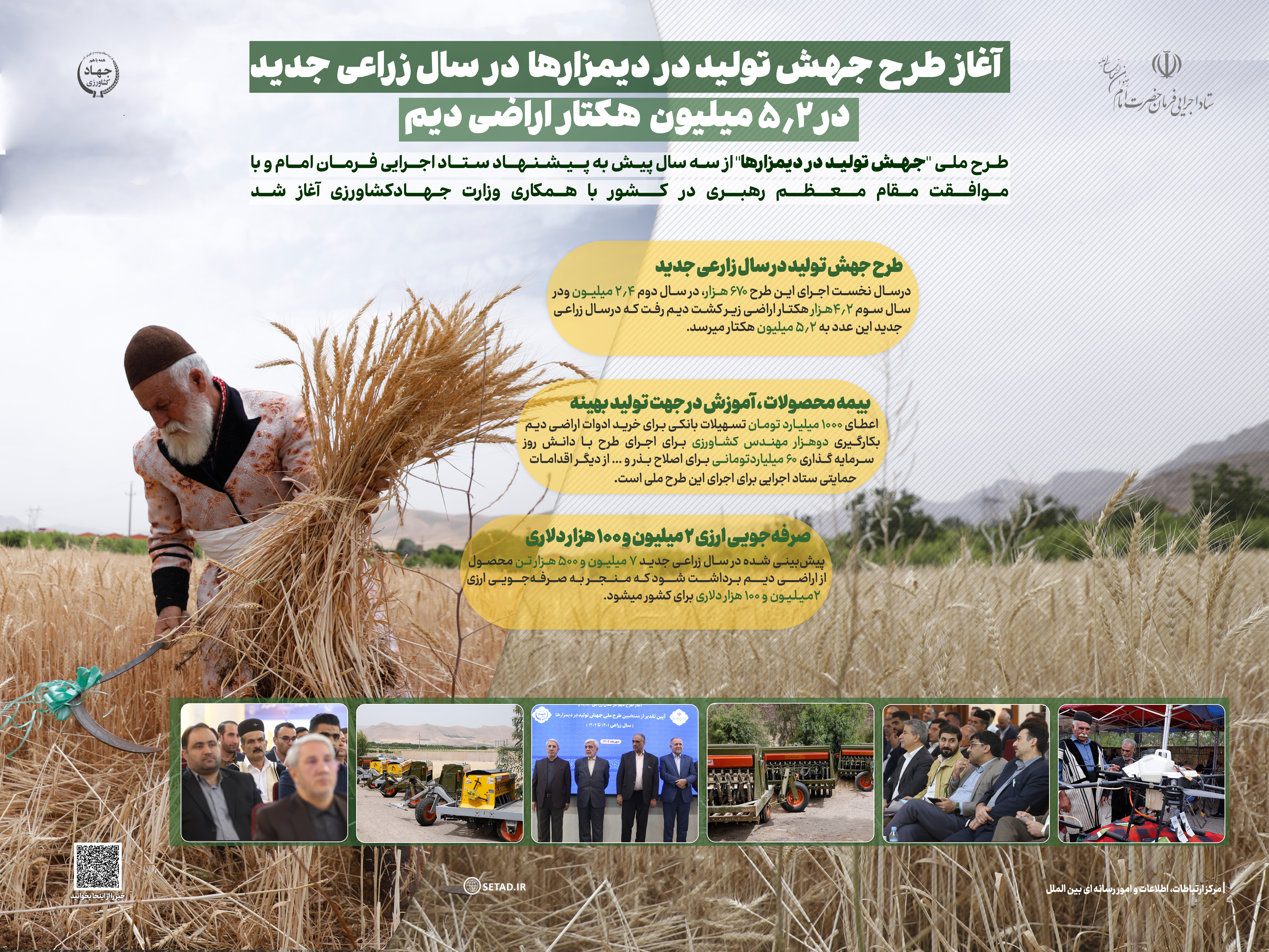چهارمین سال اجرای طرح ملی جهش تولید در دیمزارها در ۵ میلیون و ۲۰۰ هزار هکتار اراضی دیم کشور توسط ستاد اجرایی فرمان امام وبا مشارکت وزارت جهاد کشاورزی آغاز شد.